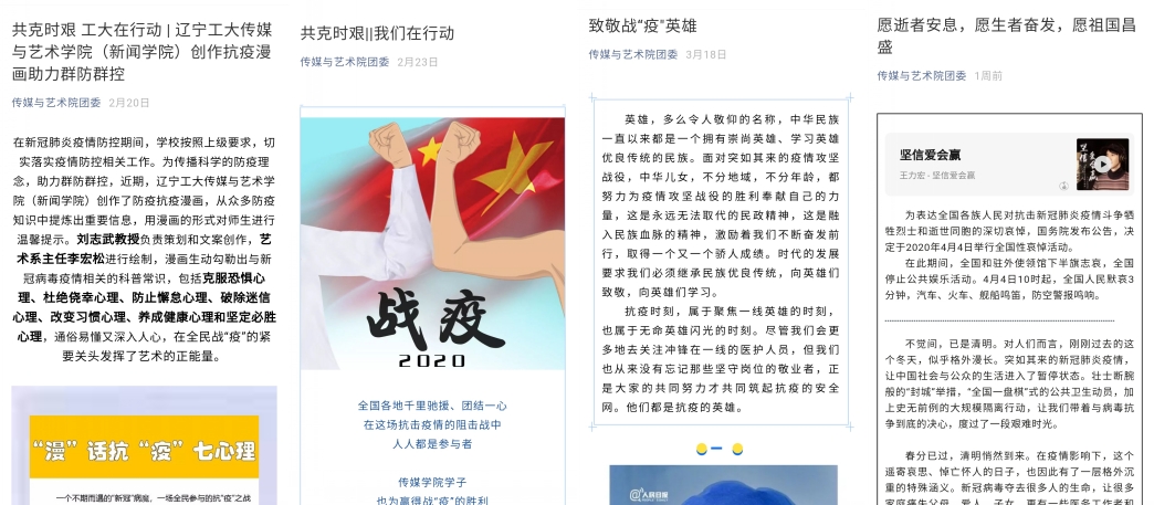 一月份以来,学院通过微信公众号发布三十余篇相关文章,包括疫情防治科普、师生防疫事迹宣传、思政大课学习、心理辅导、学校官方信息发布等,以“w88手机版登录官网团委”公众号、学校学院网站为舆论阵地,使得广大传媒师生及时了解了国家和及政府。