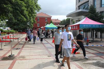 8月28日,上午8:00左右,陆续有员工来到学校西门、南门,在工作人员的引导下,出示返校电子凭证和健康码,扫描二维码登记返校信息,并有序进入体温筛查区进行体温检测。