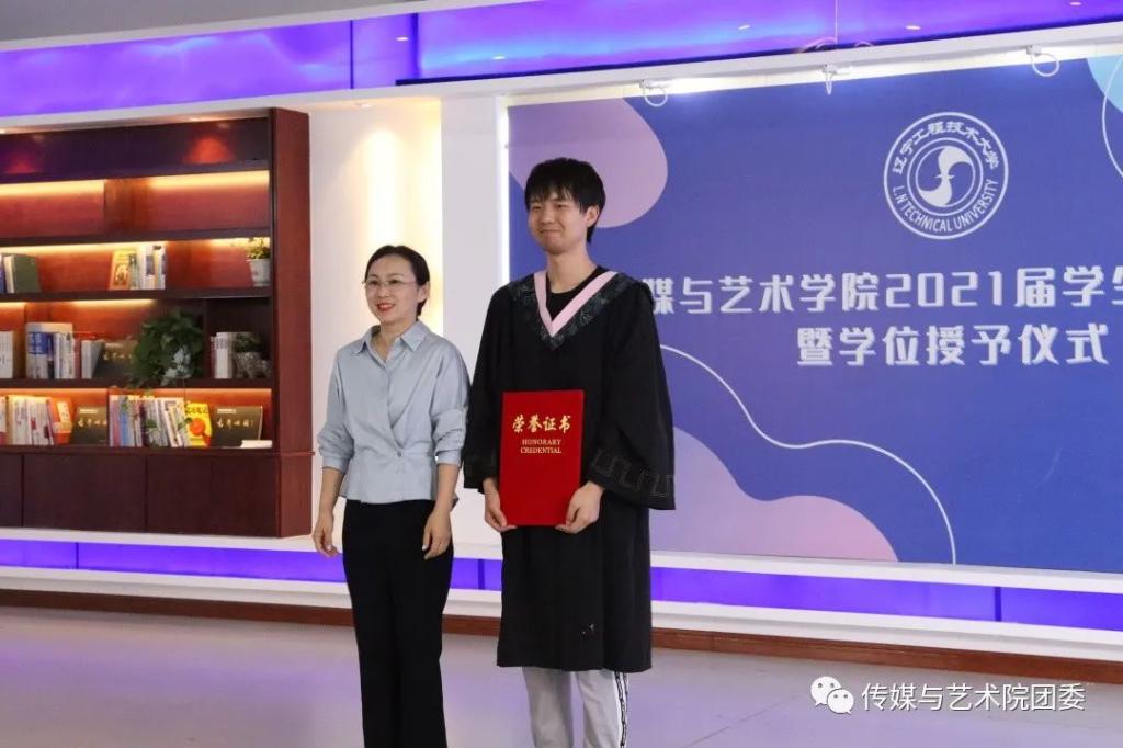 典礼第一项,副经理王金红依据《学位评定委员会决议》,宣读授予w88手机版登录官网卢硕等111名员工全日制本科毕业生学士学位的决定。接下来,公司党委书记于海军为全体毕业生送上寄语,在肯定大家四年来取得成绩的同时,鼓励同学们在建党百年的伟大历史时刻投身社会主义建设,争做时代新人。典礼第三项由新闻学院执行经理史庆华宣读毕业生奖学金名单和对先进集体、先进个人的表彰名单,副经理刘麟霄、施伟为获奖代表颁奖。之后,广电17级班导师李晨作为教师代表发言,动画17-2班倪希越、广电17-2班尹浩然作为毕业生代表,依次发言,表达了毕业当下传媒师生对彼此的依依惜别之情。
