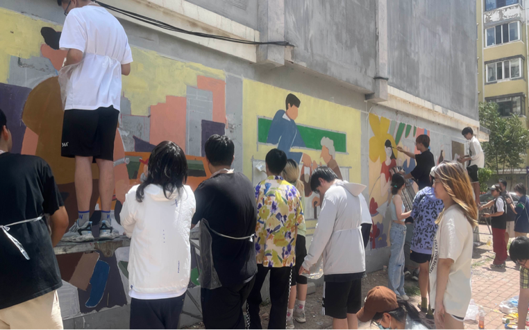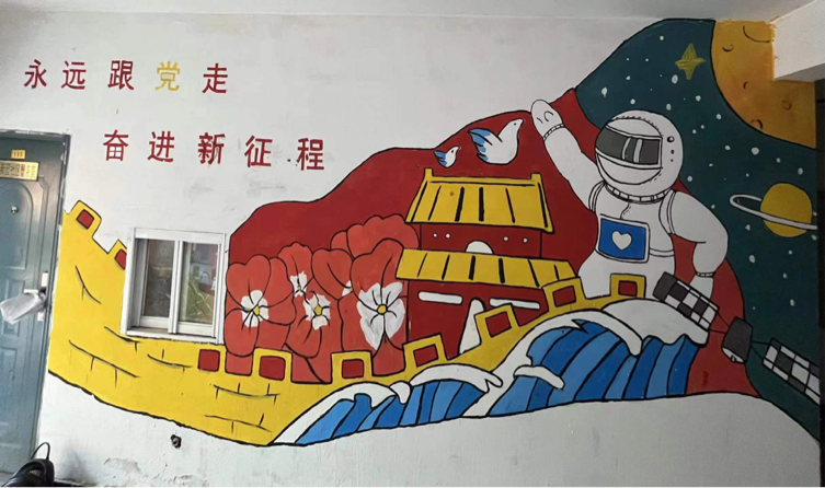 前往阜新市玉丰社区进行墙绘活动的8支队伍,选取了社区内的老旧、破损墙面进行绘画。经过多次充分的讨论和调研,同学们最终决定主题,并且充分发挥本专业的优势,精心设计每一幅墙绘作品。运用鲜艳的色彩和简洁的线条来展现社区居民们的团结友爱和美好生活的场景。将党的二十大精神通过墙绘呈现出来,给社区带来更多积极向上的能量和美好心情。同时,为校地合作,基层社会治理贡献了青春力量。