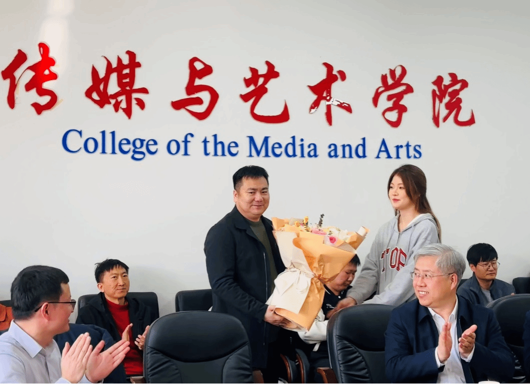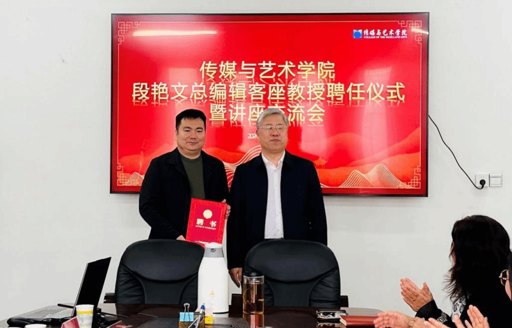 在播放广播电视学专业宣传片之后,王胜源经理发表致辞。他说,在学院新闻传播团队建设取得阶段性进展之际,举行客座教授的聘任仪式及讲座活动,恰逢其时,意义非凡。唯有推进学术研究和团队建设,学院才能更好培养员工、服务社会,也希望段艳文秘书长能够以其精湛的业务水平、丰富的学术资源、深厚的育人情怀,帮助学院建设好学科、培养好人才。